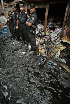 6月4日,孟加拉國(guó)安全官員維護(hù)火災(zāi)現(xiàn)場(chǎng)秩序
